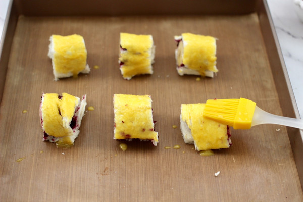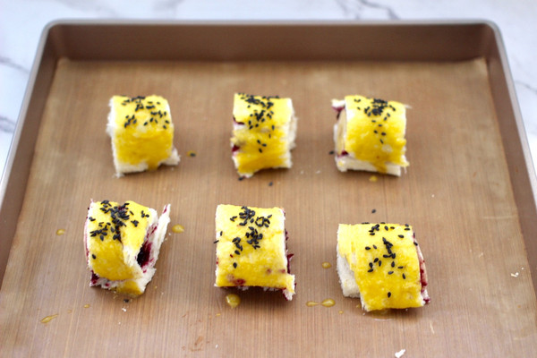 两个吐司片都做完切好块后,鸡蛋打散后,鸡蛋清不用,把蛋黄搅拌均匀,用刷子在吐司卷上刷上一层薄薄的蛋黄液。
