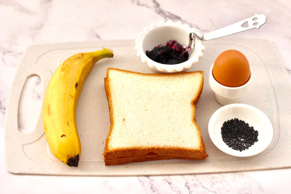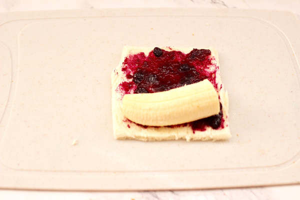 蓝莓酱上面铺上切开的香蕉。