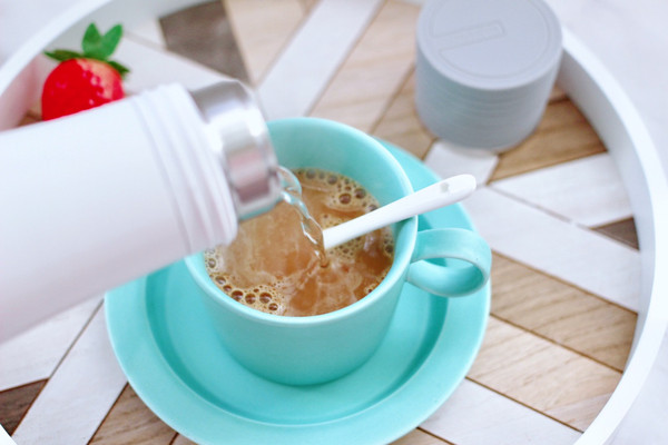 咖啡粉倒入杯中,用口袋电热水杯烧开水后,倒入杯中里,用勺子把咖啡搅拌均匀即可。