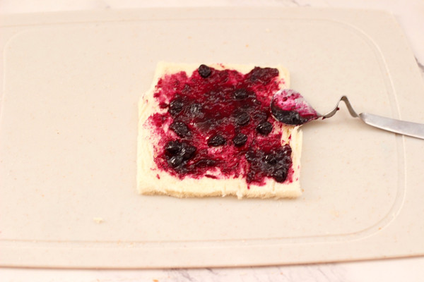 在擀薄的吐司片上,均匀地抹上有颗粒的蓝莓酱。