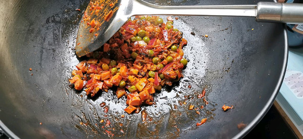 加入米饭翻炒均匀,加入酱油,芝麻油调味,自己注意咸淡。