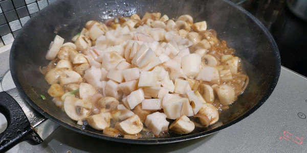 食材准备 藕切丁,蘑菇一切四 大蒜粒,红葱头切薄片