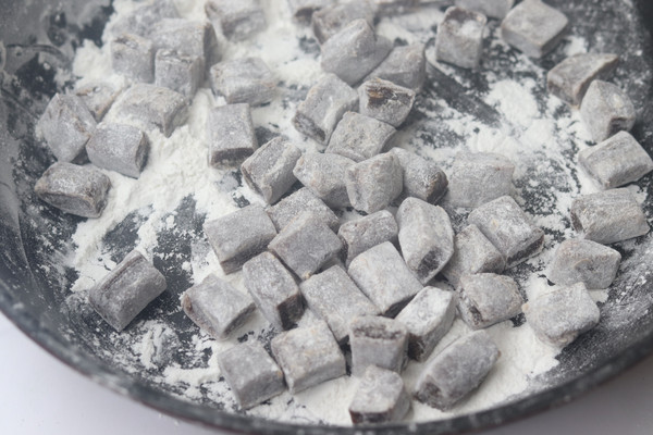 去掉油纸后,在姜糖的两面都撒上熟糯米粉,切换成长条。