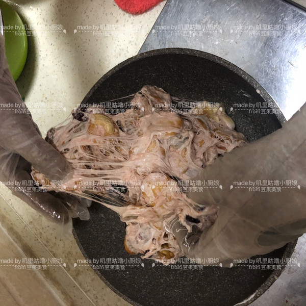 差不多大致粘好食材,立马戴毛手套之后再套一个合适大小的PVC手套,不断从内向外翻掰混合物,目的就是尽量让棉花糖丝均匀包裹每个食材