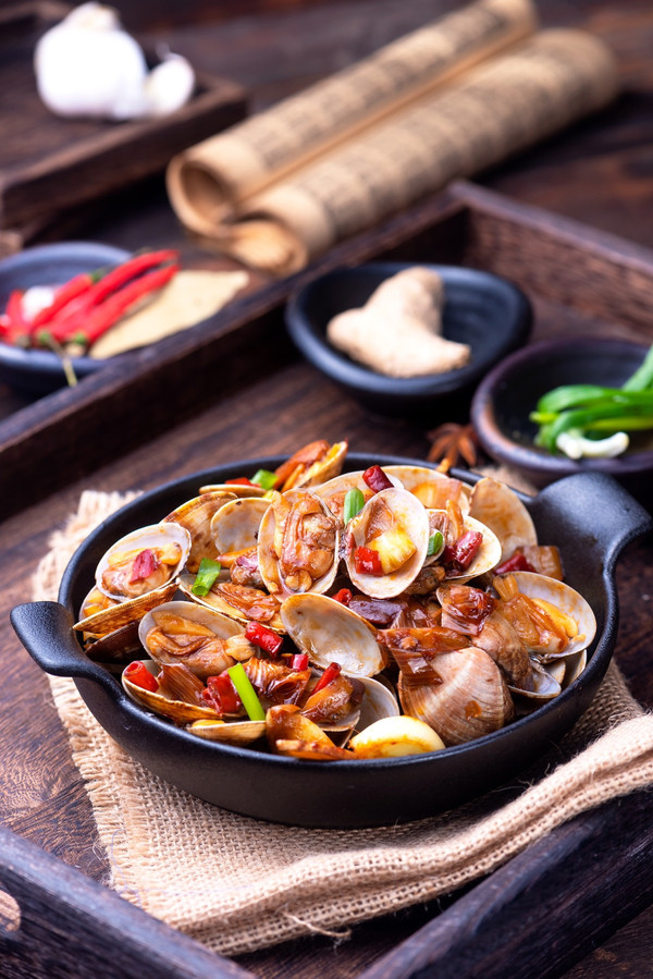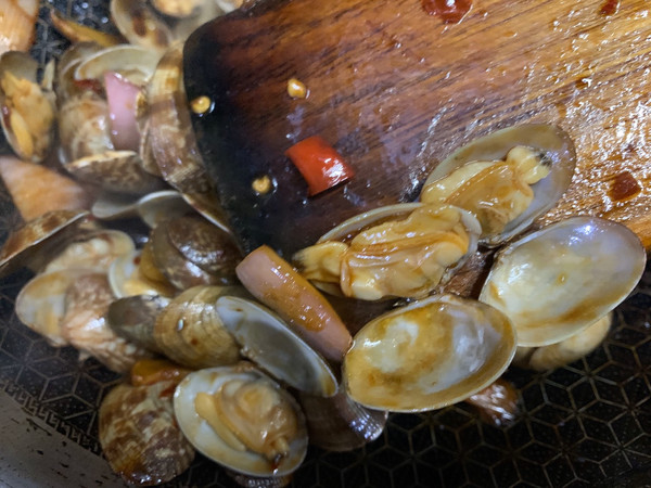 时间不能长,1分钟左右,花蛤刚刚全打开就要捞起来,不然一会炒肉就会全掉了
