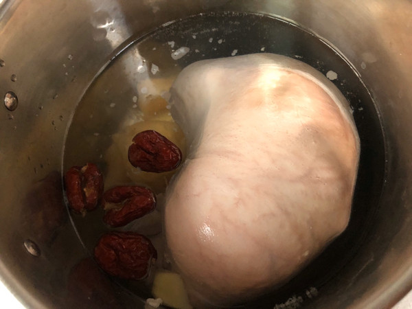南方人更喜欢补,所以放了两只花胶在里面,加入四颗红枣,用水煲1个半小时在捞出,可以看到汤会变成奶白色