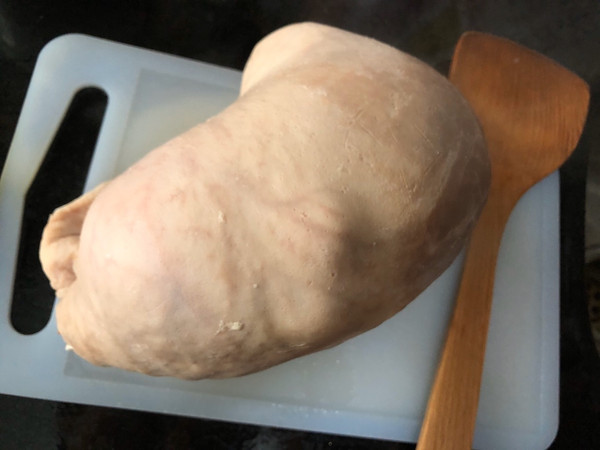 然后将葱结,三片姜,一半白胡椒粒放进鸡的肚子里,再将鸡塞进猪肚里面用牙签封好口,这个图片是封好口之后的照片,放入冷水里焯三分钟捞出,汤不要