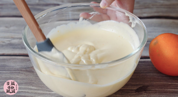 做慕斯糊:酸奶、橙皮屑、橙汁、糖混合搅拌均匀。