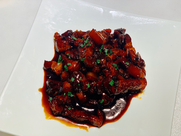 炒出香味后加入没过肉的冷水,加入老抽、生抽、盐、糖、料酒大火煮开转小火慢炖一小时收汁即可。(由于每个人的锅和煤气火力不同,期间要多翻锅盖看看收汁情况)