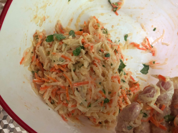 把挤干水分切好的萝卜丝,姜末和香菜碎放入容器,加十三香,加一大勺面粉搅拌