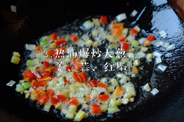 第3步骤热油爆炒大葱,姜蒜红椒。