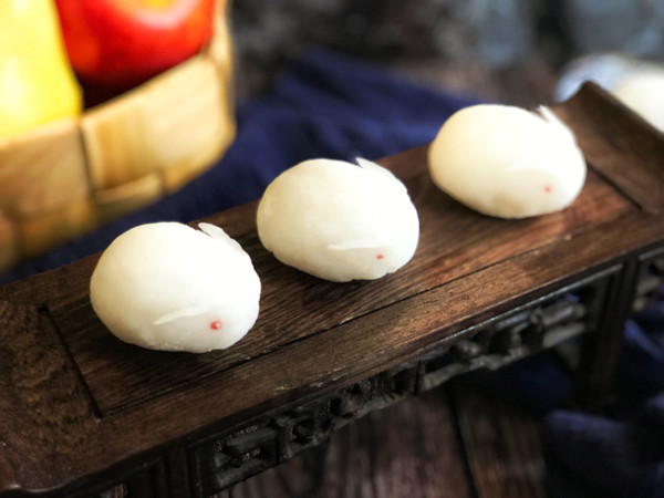 然后搓圆把有褶子的一面朝下,用手把整个月饼塑形成前面窄后面宽的形状,有褶子的一面可以是平面当兔子的脚,兔子的背部尽量成弧度,尤其是屁股要大一点