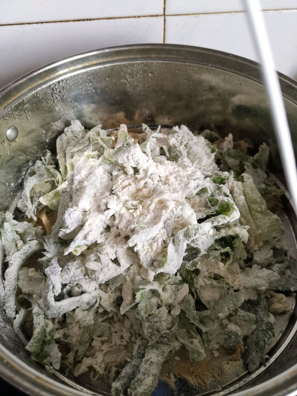 底部放一个纱布垫底,然后把拌好的菜放入蒸锅中
