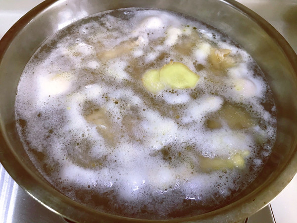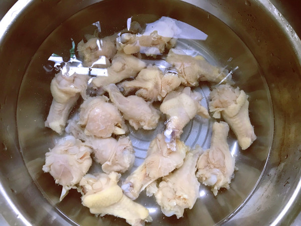 小翅根清洗干净 一个个检查看看有没有小毛毛 锅里放入小翅根倒入清水➕生姜片➕料酒➕白醋去除腥味 开大火