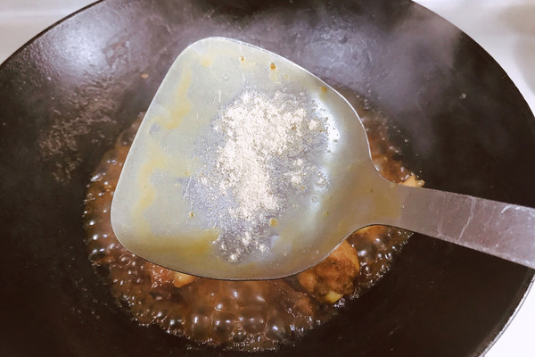 收汁越来越浓稠的时候 适量放一点鸡精和胡椒粉搅拌搅拌 不需要放盐 酱油本身就是有含盐 如果放了会越来越咸