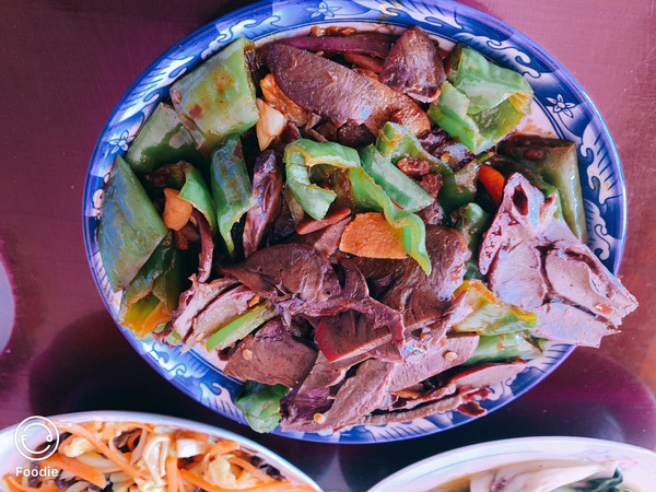 起锅烧油,下花椒,葱姜蒜,红油豆瓣炒香,放入猪心片淋入料酒少许,大火翻炒半分钟,放入青椒翻炒,导入生抽,青椒断生即可出锅。