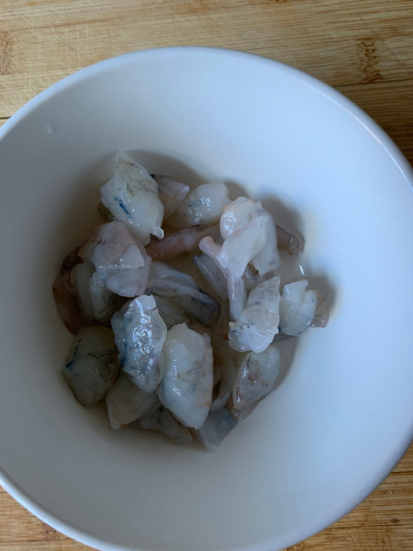 大虾切成粒,包馅的时候每个包子里放几粒,可以不放,我是昨天炒饭剩了几个大虾,顺手用了