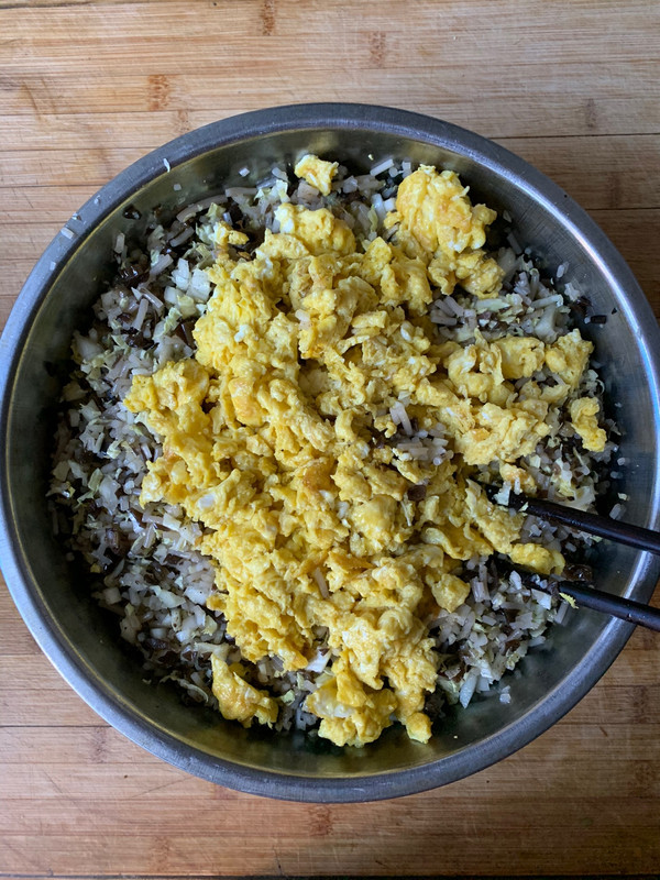 馅中先放入植物油拌匀,再放入花椒拌匀,倒入鸡蛋拌匀,根据个人口味加入食盐味精拌匀