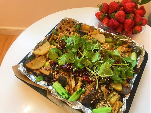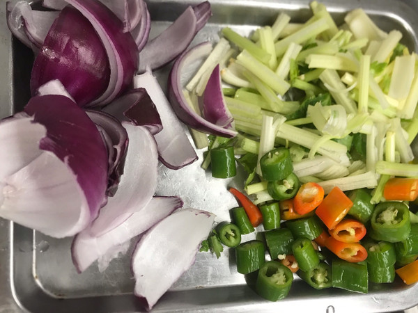 菜炒断生就可以,因为一会儿还要进烤箱,所以不要炒太久哦!最后下芹菜和辣椒段和黄瓜再一起翻炒一下就可以起锅备用啦。
