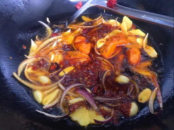 炒香之后下两勺郫县豆瓣两勺火锅底料,火锅底料化开之后下干辣椒干花椒。干花椒其实很脆弱,下早了容易炒糊就没有麻味了