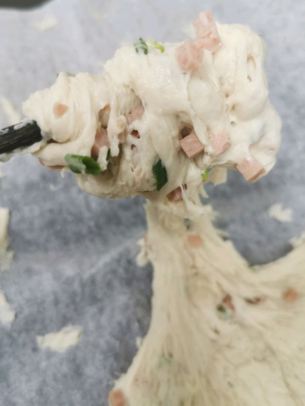 抓小面团,擀(压)面团,加入葱和火腿,造型随意