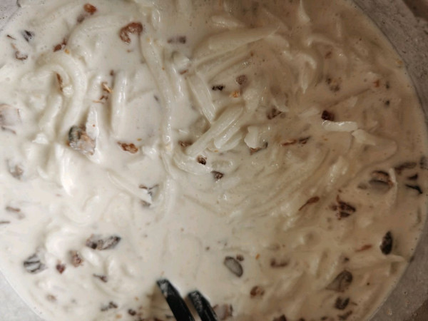 17,圆盘中刷油,倒入萝卜丝浆。