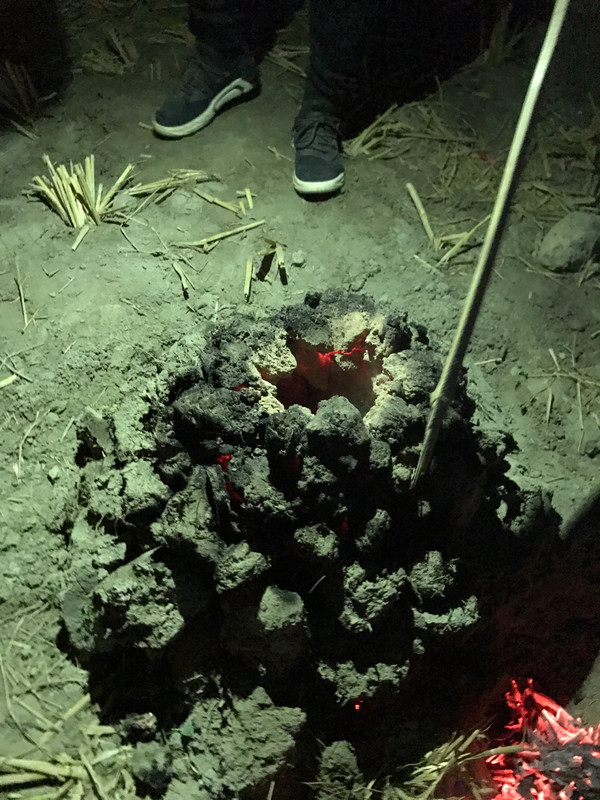 泥土都烧红了 边烧火边香 泥土烧到这个程度基本没问题啦 上面先敲几块泥土 拍碎了放番薯进去 快速放一层番薯后再敲几块泥下去 再放一层番薯 如果窑鸡 最好把鸡放下面 放一层泥 因为红薯熟的快