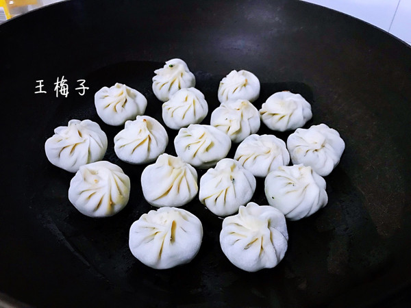 平底锅烧热,调为小火,锅底刷一层油,挨个挨个放入包好的包子,煎到底部金黄时。