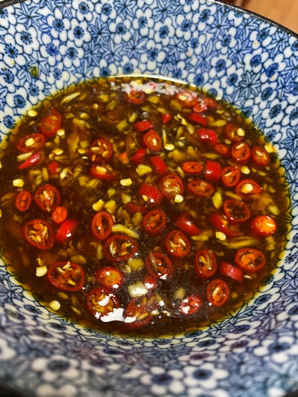 切小米椒,加生抽、味极鲜、白糖少许、芥末、温水搅拌均匀