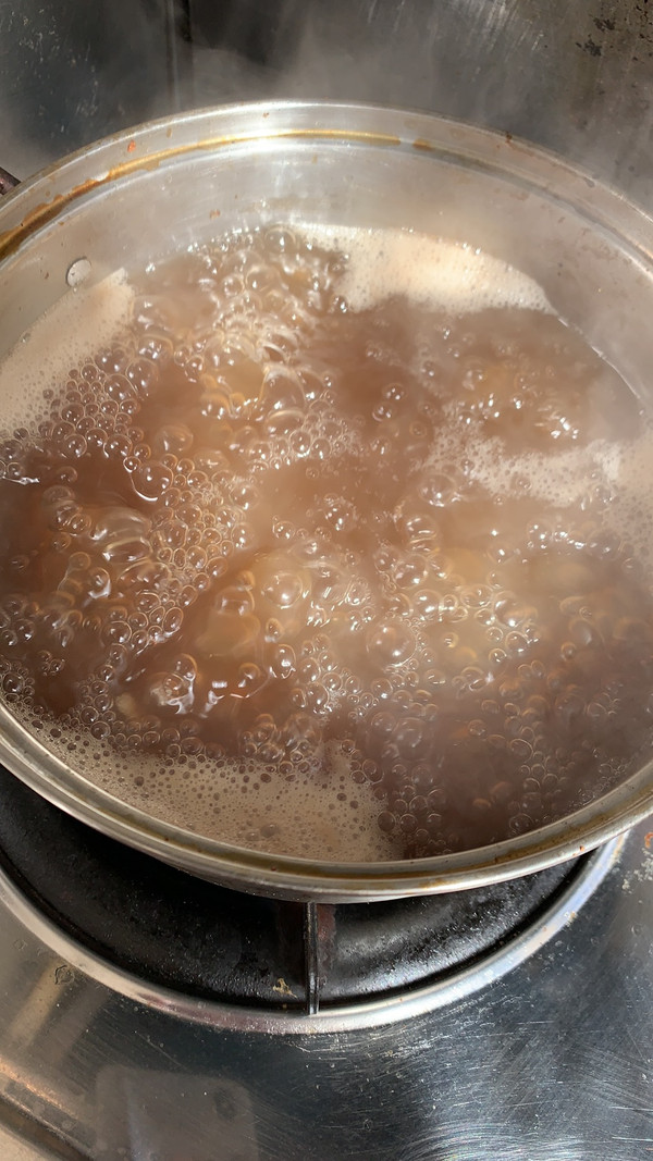 煮到冒大泡的时候就要开始不断搅拌锅,以防溢出或者糊锅,煮到这样冒小泡,汤汁浓稠就可以了