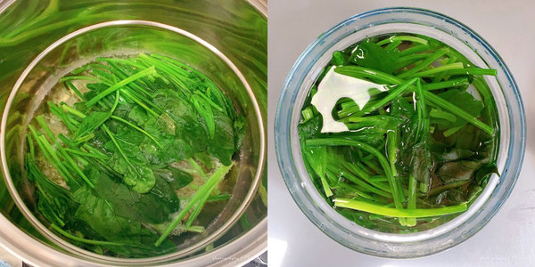2、菠菜下热水焯熟,捞出放凉水内备用;