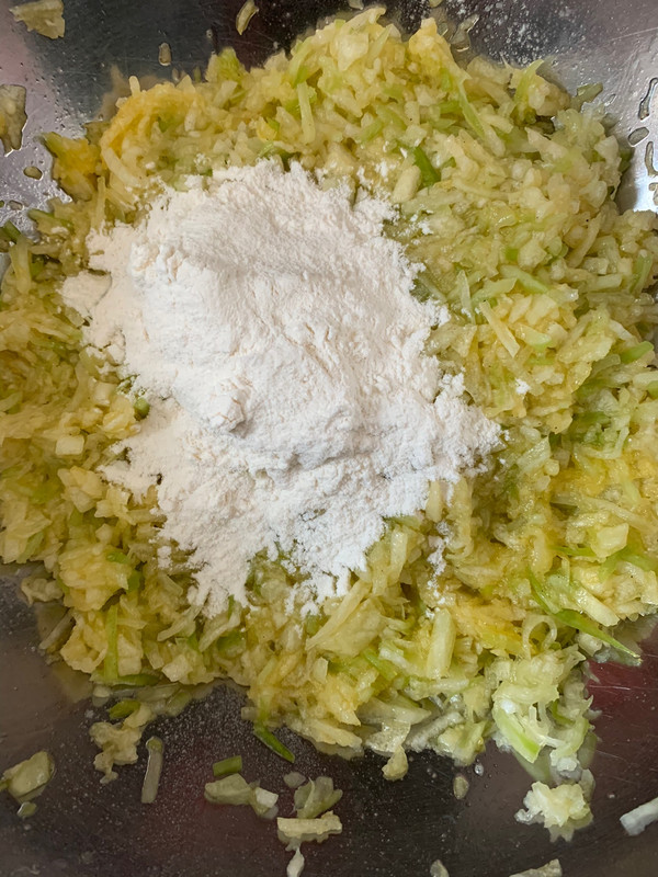 已经腌过了,所以不再加盐。 加一勺生抽,适量五香粉,少许鸡粉,两个鸡蛋,拌匀。 再撒适量面粉。搅拌成糊状。 其实我还加了一把虾米,口感更好。只是忘拍虾米的图。