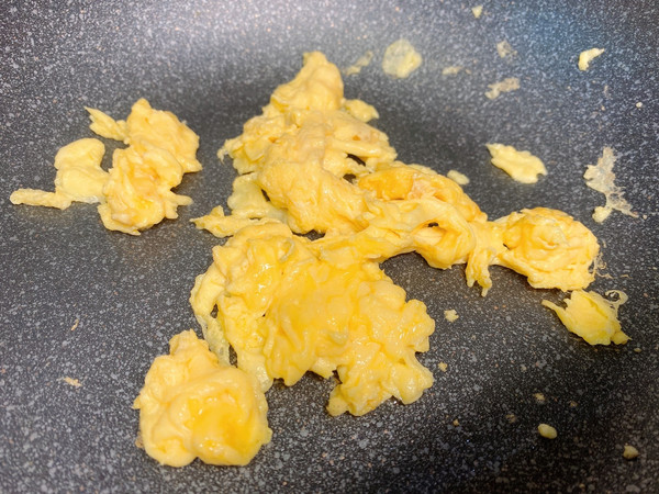 锅烧热倒油 油热 把打好的鸡蛋锅里炒几下 炒鸡蛋很有技巧 快速翻炒几下 马上起锅 鸡蛋不要一直在锅里翻来翻去炒 炒好盛碗里放着备用