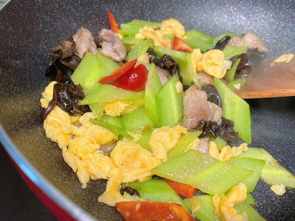 肉盛出来后 锅里再倒一点点油 把黄瓜和黑木耳倒进去 翻炒几下 加一点点盐 炒几下 把刚才炒好的肉片和鸡蛋倒进去 炒一起 加几颗鸡精 不喜欢也可以不加 起锅