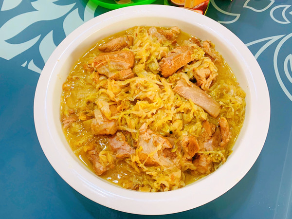 放入酸菜,将攥干的酸菜散开,均匀放入。