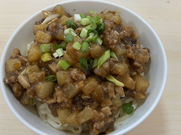 根据喜好在面条里加炸酱,略微搅拌后即可开吃。