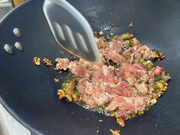 姜末蒜末用油炒出香味,加入豆瓣酱和葱段,葱不要放完。