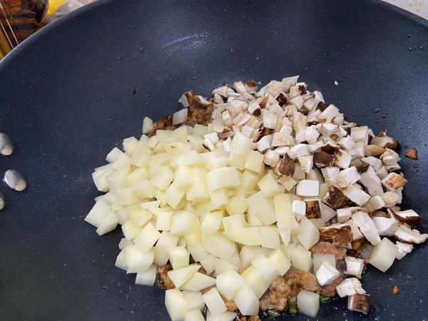 翻炒一会儿,放入少许水、盐、十三香,煮三分钟放入小半碗淀粉汁。 汤汁黏乎的时候放入鸡精、剩余葱段即可出锅
