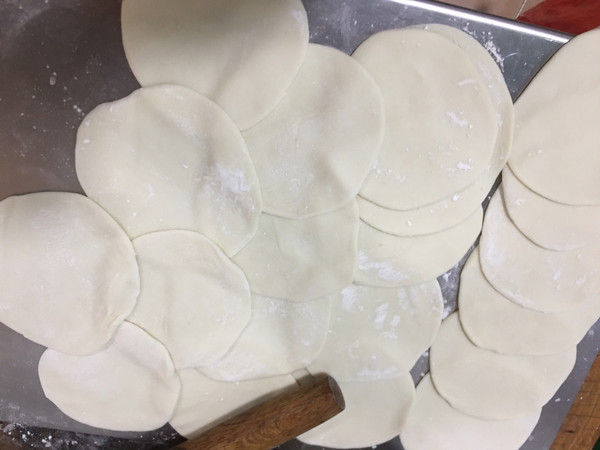 如果面剂太软 可以稍微揉一下 把面剂子按扁擀成饺子皮(差不多掌心那么大就可以了) 尽量把每个面剂子擀成大小一致