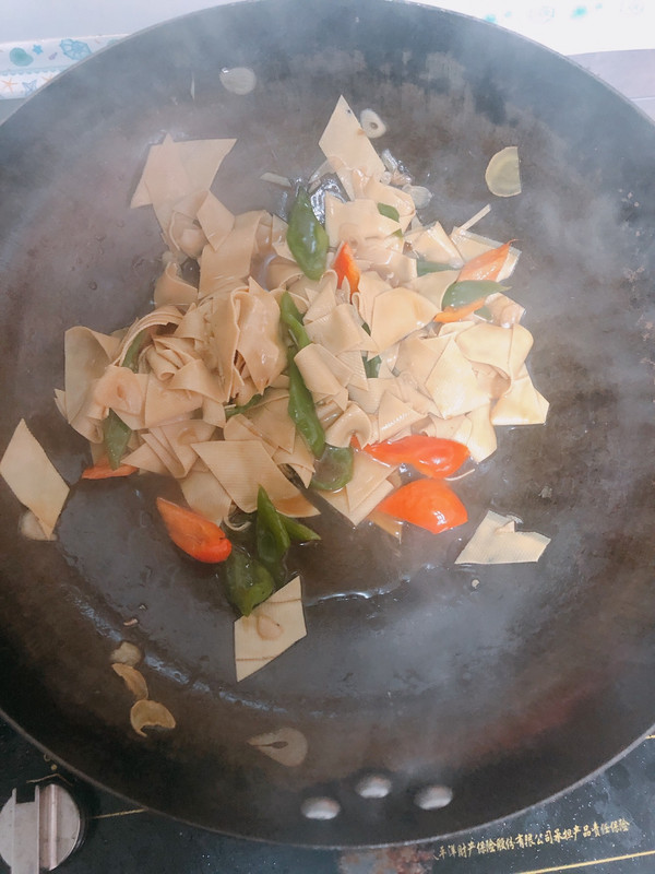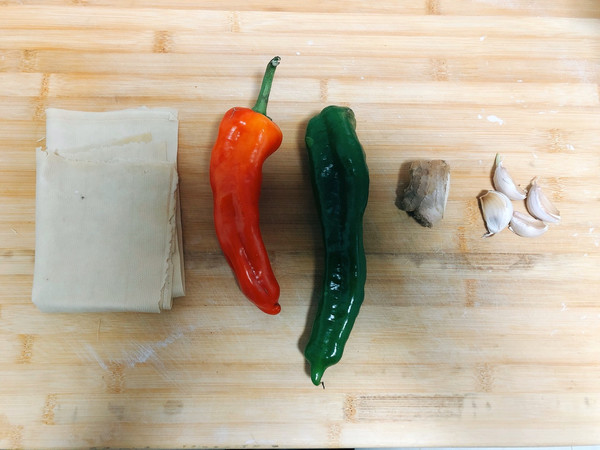 准备主料:千张三张,辅料:青红椒各用一半,姜蒜适量