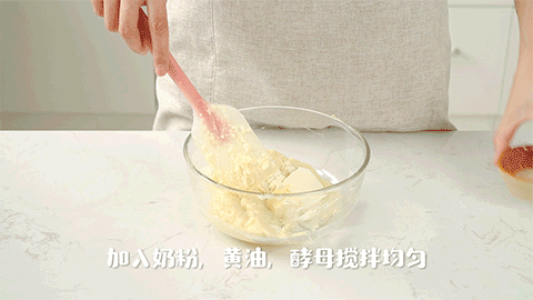 加入白糖、鸡蛋搅匀,再加入奶粉、黄油和酵母搅拌均匀