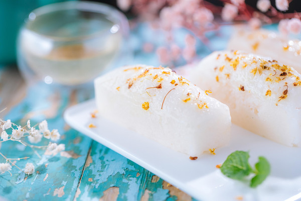 撒桂花干装饰,送入大火烧开的蒸锅里。