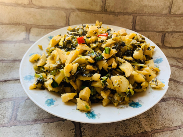 放入笋丁继续翻炒,倒入少许生抽,少许盐,继续翻炒,酸菜汁融入到笋里了