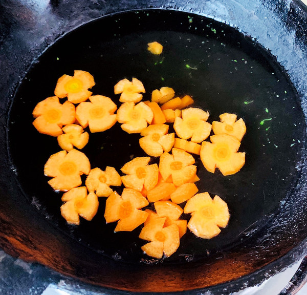 胡萝卜切成花片状,焯水。