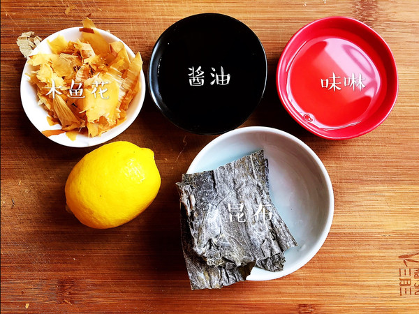 制作柑橘酱油:柠檬榨汁备用,味啉、酱油、昆布(小块,用剪刀把边缘剪几刀,方便入味),木鱼花。