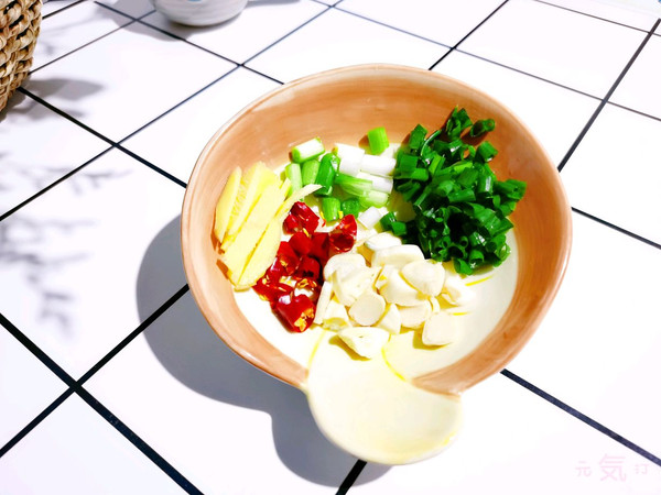 小葱切碎,葱白与葱绿分开放,蒜切片,干红椒切碎,姜切丝。