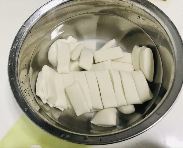 面粉用大的盆,把150毫升的冷水慢慢加入面粉中,用筷子搅拌至图中