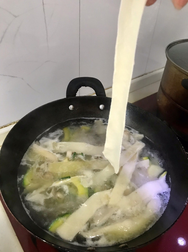 准备一壶刚烧开的水,炒到菜有点变色,放入半壶水,拿起面条用冷水拉薄拉长,放入锅内,等大部分弄好时,放入蚕豆,因为蚕豆很容易熟,面条全面入锅内,放笋干菜,放适量盐