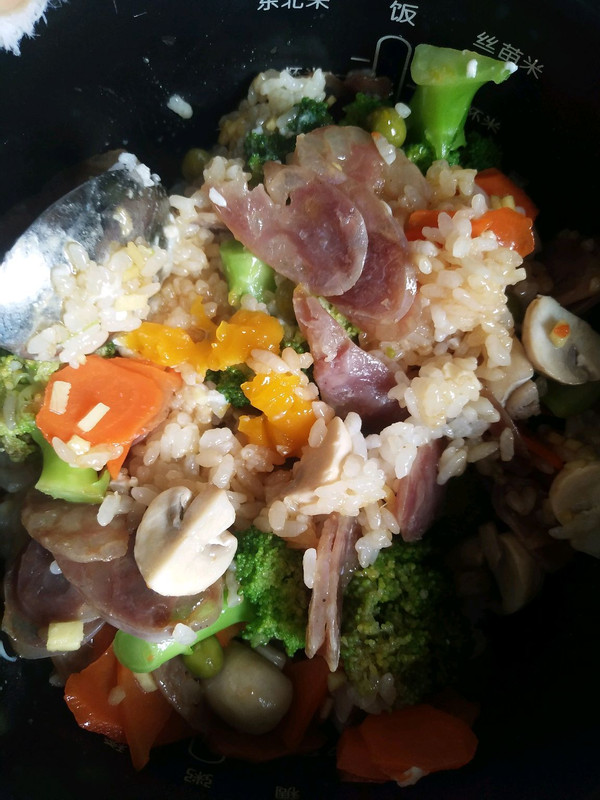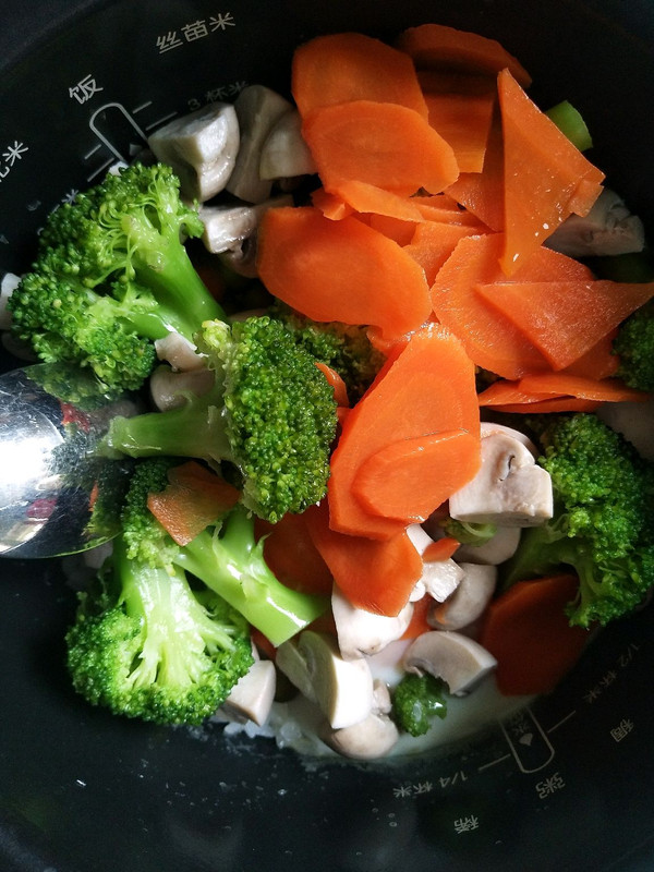 加入熟的青菜胡萝卜,我还会加入焯过水的口蘑,也是我家娃儿的最爱。尽量控干蔬菜里的水,不然加到饭里,饭也会水水的。