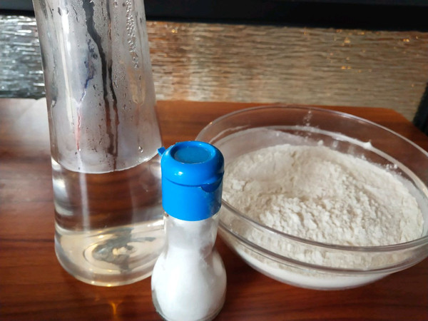 撒盐,依次加进热水,搅拌成面絮